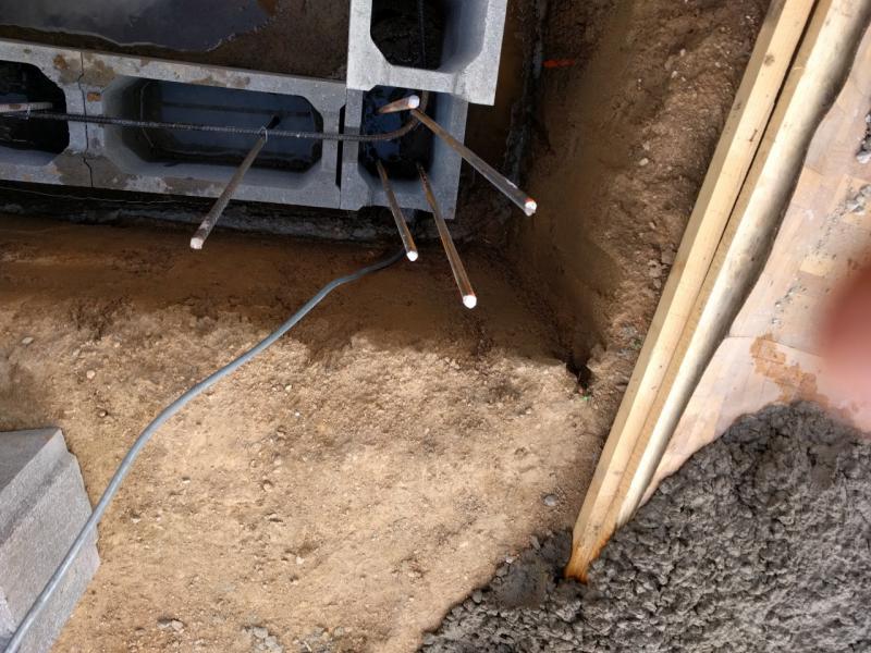 Takže jsme museli do rohu patky navrtat další 4 metrové roxory, provázali je třmínky, čímž vznikl železný sloupek, který se následně vylil betonem. Než se bude vylívat deska, ještě se sloupek proplete do dvojité kari sítě, opět prováže, a tím by mě být základ v rohu dostatečně připravený pro zátěž sloupku.