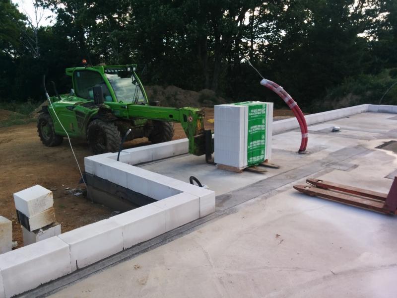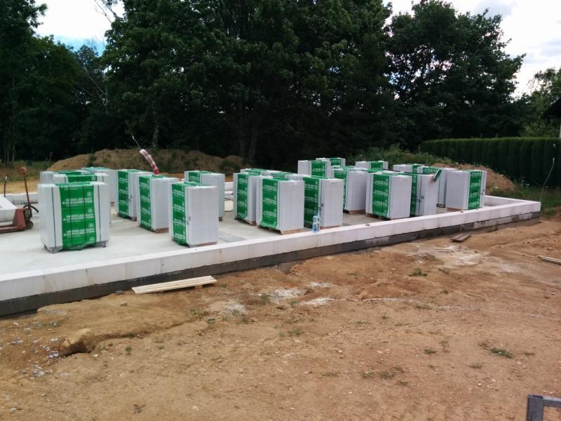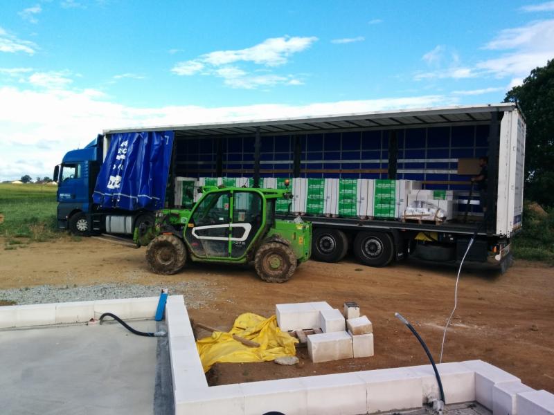 Vzhledem k tomu, že si musíte sami zajist vykládku z kamionu, musel jsem sehnat nějaký manipulátor, terénní ještěrku a nebo traktor s vidlemi. Protože to bylo docela na poslední chvíli a ještě celkem blbý termín (nemoci, dovolené, začátek prázdnin), neshánělo se úplně dobře. Nakonec jsme ale sehnali bagr s vidlemi z blízkého kravína :-). Dnešní parta se sešla nádherně, všichni šikovní, a tak šlo vše přesně podle představ. Řidič manipulátoru nám palety vyložil na desku, kde už jsme si to se švagrem umístili podle potřeby paleťákem. Sehnáním vlastního vykládacího stroje jsme ušetřili přes 3 tisíce, oproti ceně stavebnin za složení.