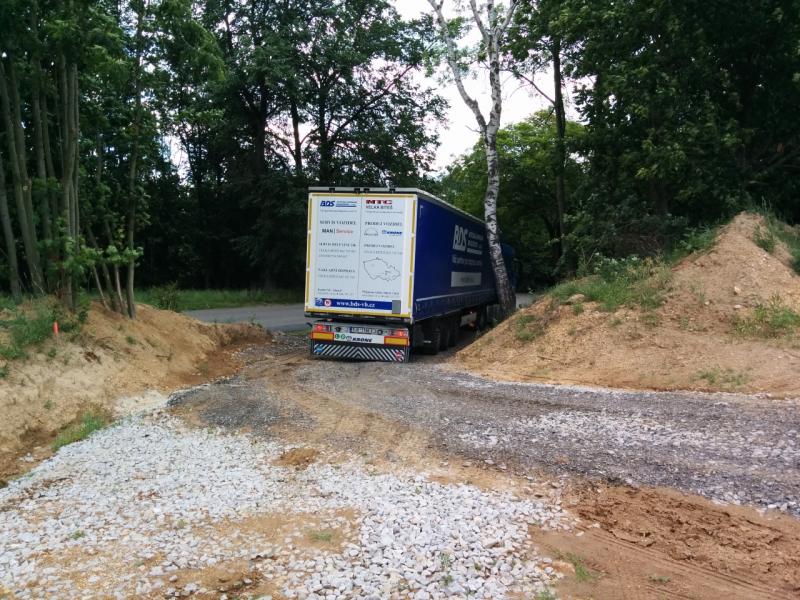 Další oříšek, který jsme řešili byl ten, jestli vůbec kamion vyjede (nebo taky jestli kamioňák bude chtít vyjet) až k nám na pozemek. Popravdě, měl jsem to tak 55:45 ano/ne. Nakonec byl ale řidič opravdu super a vůbec se toho nebál. Také nám samozřejmě hrálo do karet, že nepršelo, protože jinak by to bylo na pozemku samé bláto a to by určitě uvízl. Důležité ale určitě je mít plán B.