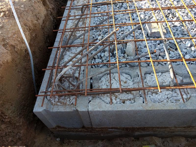 Následovalo vyztužení sloupku. Měli jsme už z dřívějška připravený vytřmínkovaný ocelový sloupek, který trčel ze ZB a bylo ho potřeba dvojitě vyztužit kari sítí. Postupovali jsme tak, že jsme nejprve na sloupek vložili jednu síť, naohýbali na ní roxory, svázali, položili další kari síť, ohnuli poslední roxor a znovu provázali. Detail je možné vidět na fotce.