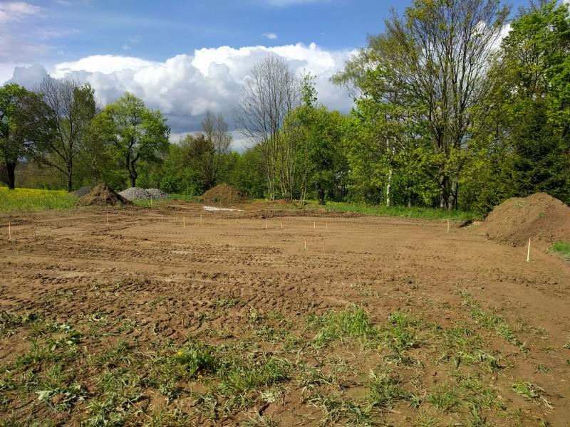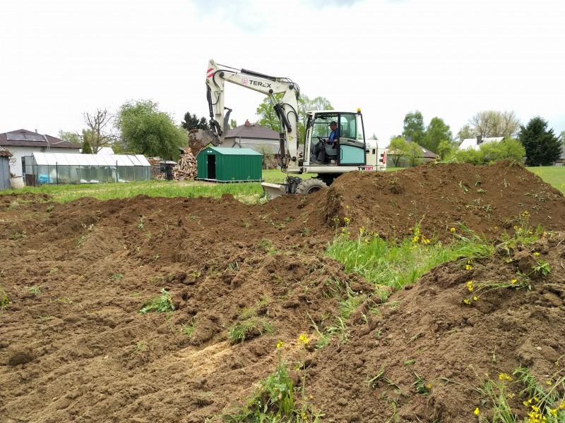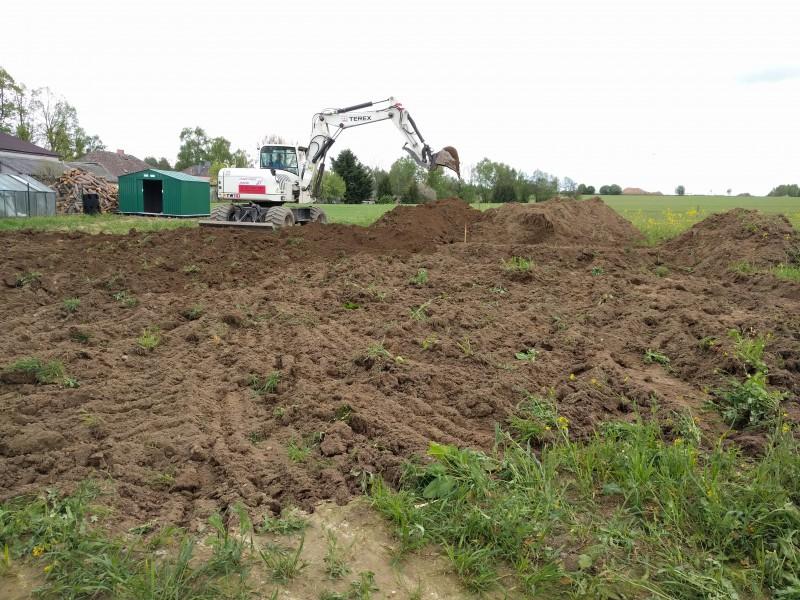 Před bagrováním základů bylo nutné provést v prostorách domu a v jeho bezprostřední blízkosti (asi 1,5 metrů) skrývku ornice. Vzhledem k tomu, že v minulém roce zde zemědělci pěstovali řepku, znovu se tam vysemenila, takže před plánovaným příjezdem bagru se šlo ještě pěkně ručně plet – aspoň ty největší rostliny, které měly už 50 až 100 cm, s těmi menšími si pak bagr poradil sám.