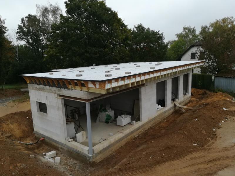 Jak jsem už psal, střechaře jsem měl domluvený na pondělí 18. září, ale už o víkendu jsem věděl, že jestli to stihneme, bude se muset stát zázrak. Nicméně zvládli jsme jim připravit atiku, aby mohli začít alespoň s plechařinou okolo a my získali další den, nakonec to byly dny dva, na dokončení polystyrénu nad předsazenou částí střechy.