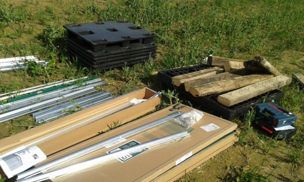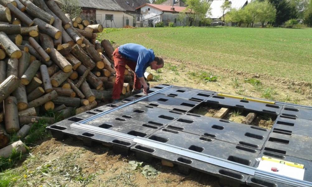 Při průzkumu na internetu, jak boudu postavit jsme narazili na informaci, že její stavba bude trvat cca 3-4 hodiny, takže si na to vyčleňujeme jedno dopoledne. Přímo na hlínu ji nechceme postavit, takže jako podlahu volíme plastové palety o rozměru 120x80cm, které dostáváme zadarmo a které ještě vyrovnáme 12 dřevěnými trámy.